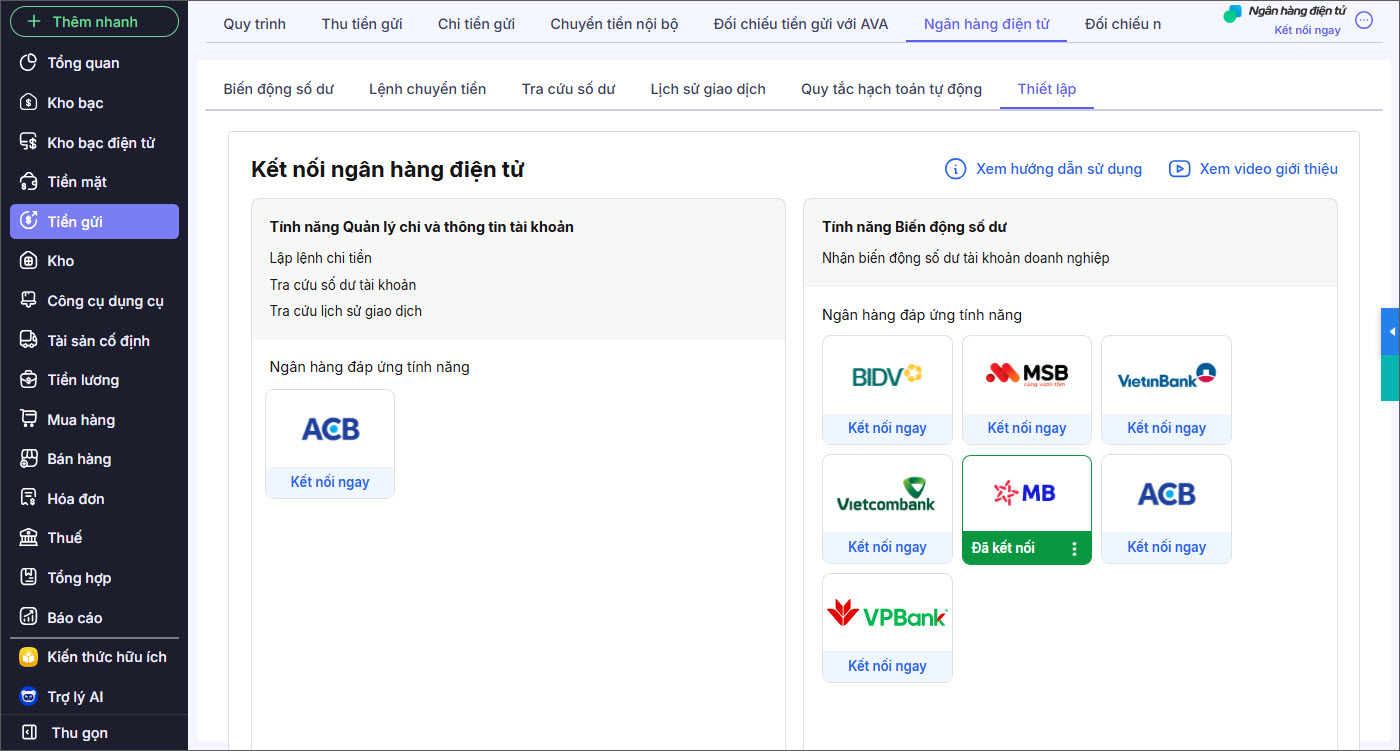 Ngân hàng điện tử là tính năng cho phép kết nối trực tuyến với ngân hàng từ phần mềm Mimosa Online để thực hiện tự động một số nghiệp vụ: chuyển tiền thanh toán, tra cứu số dư và lịch sử giao dịch,… giúp đơn vị có thể thực hiện các nghiệp vụ trên một cách nhanh chóng mà không phải ra ngân hàng, tiết kiệm thời gian và chi phí cho đơn vị.