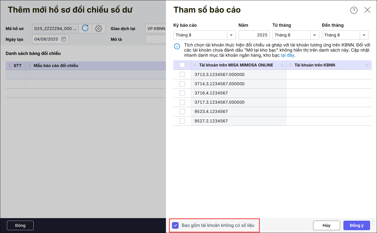 2. Tích chọn “Bao gồm tài khoản không có số liệu” => Cột Tài khoản Kho bạc trên MISA Mimosa sẽ lấy cả các tài khoản không có phát sinh để thực hiện ghép.