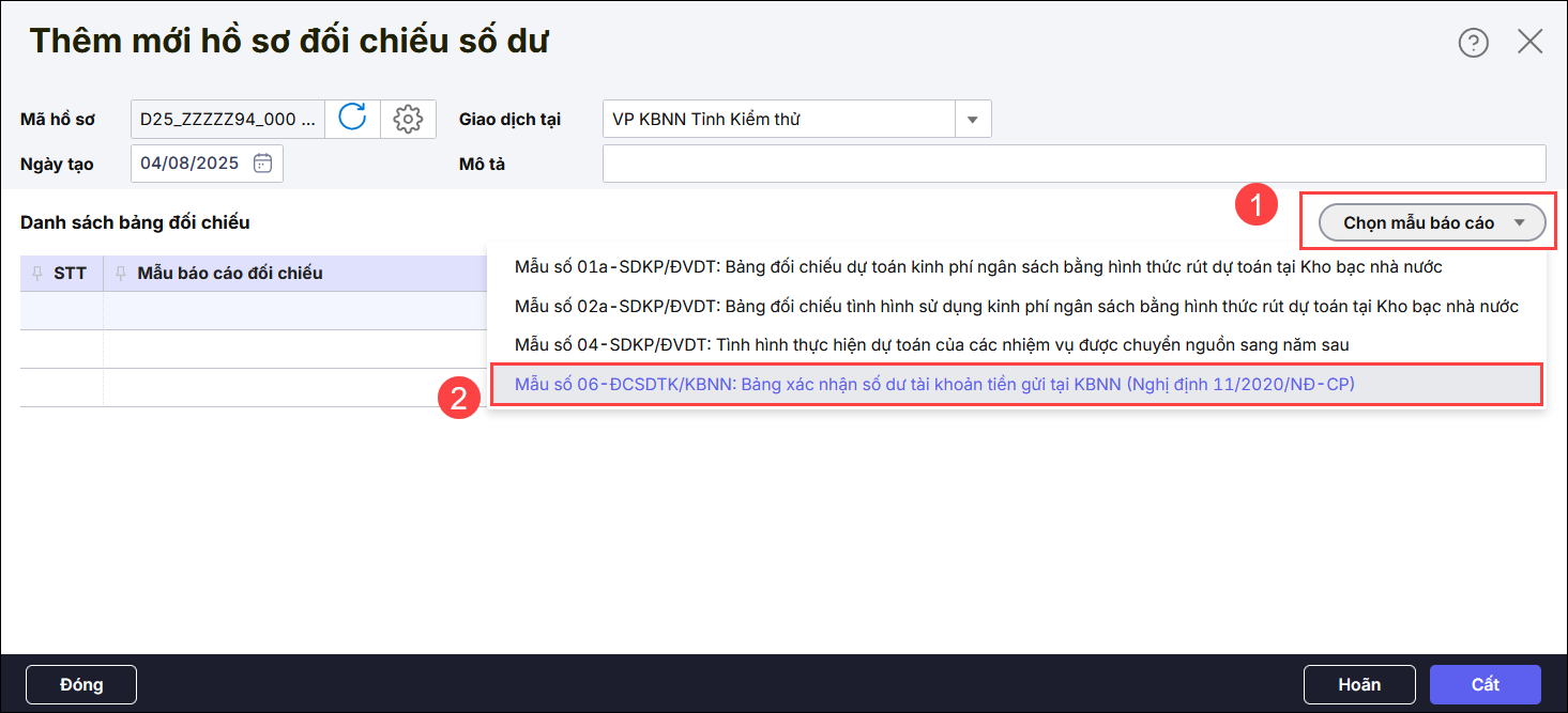 1. Khi lập hồ sơ đối chiếu số dư, chọn mẫu báo cáo Mẫu số 06-ĐCSDTK/KBNN: Bảng xác nhận số dư tài khoản tiền gửi tại kho bạc nhà nước