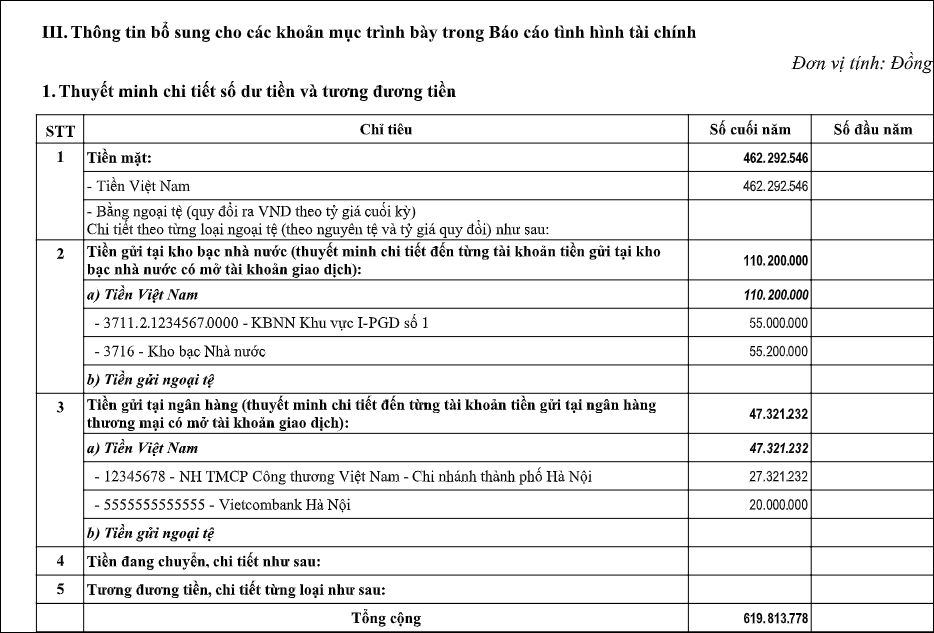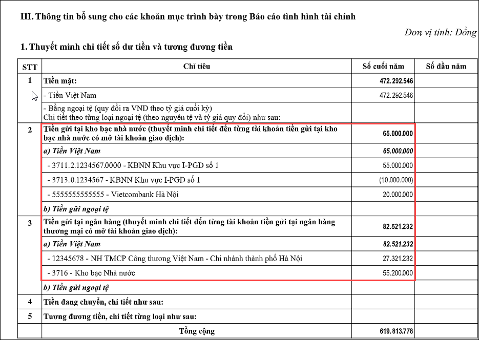 Tài khoản ngân hàng lên mục 2 – Tiền gửi tại kho bạc nhà nước khi trong danh mục \Tài khoản ngân hàng, kho bạc anh/chị tích vào ô Mở tại kho bạc . Trường hợp không tích ô Mở tại kho bạc, tài khoản sẽ được tổng hợp vào mục 3 – Tiền gửi tại ngân hàng.