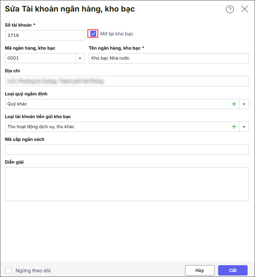 Bước 2: Tích đúp vào tài khoản tiền gửi được mở tại kho bạc như 3713, 3716.. rồi tích vào “Mở tại kho bạc”. Nhấn Cất