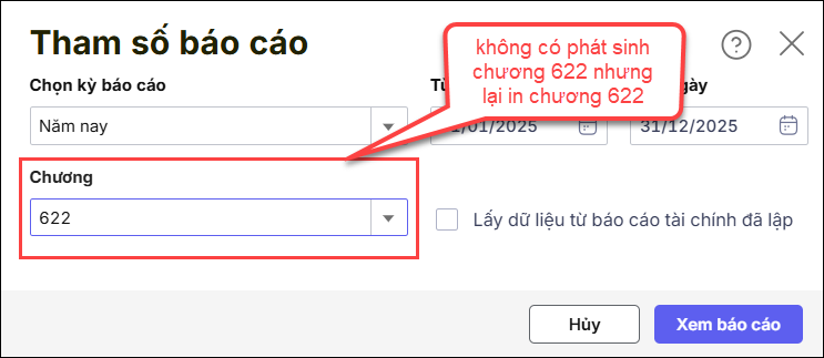 2.1 Nguyên nhân 1: Do tham số báo cáo khi in đang chọn CHƯƠNG không có phát sinh để in.