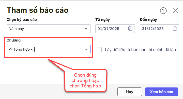 Giải pháp 1: Tại ô Chương chọn Tổng hợp hoặc chọn đúng chương có phát sinh để xem báo cáo.