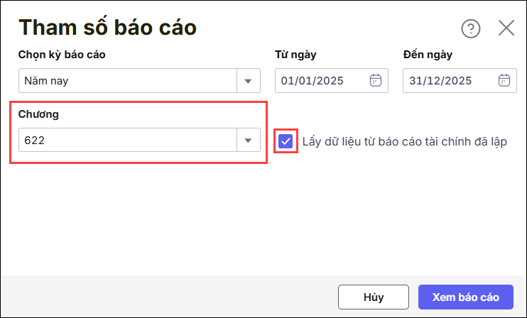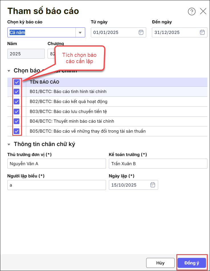 • Chọn năm, chương, chọn báo cáo cần lập. Tích Đồng ý