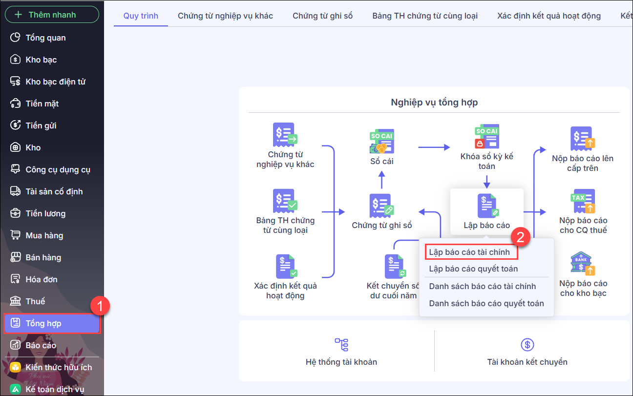 • Vào Tổng hợp\Lập báo cáo\Lập báo cáo tài chính