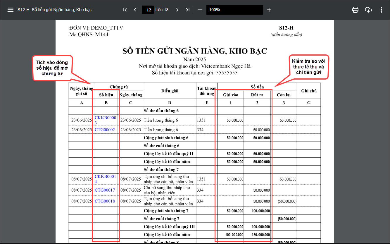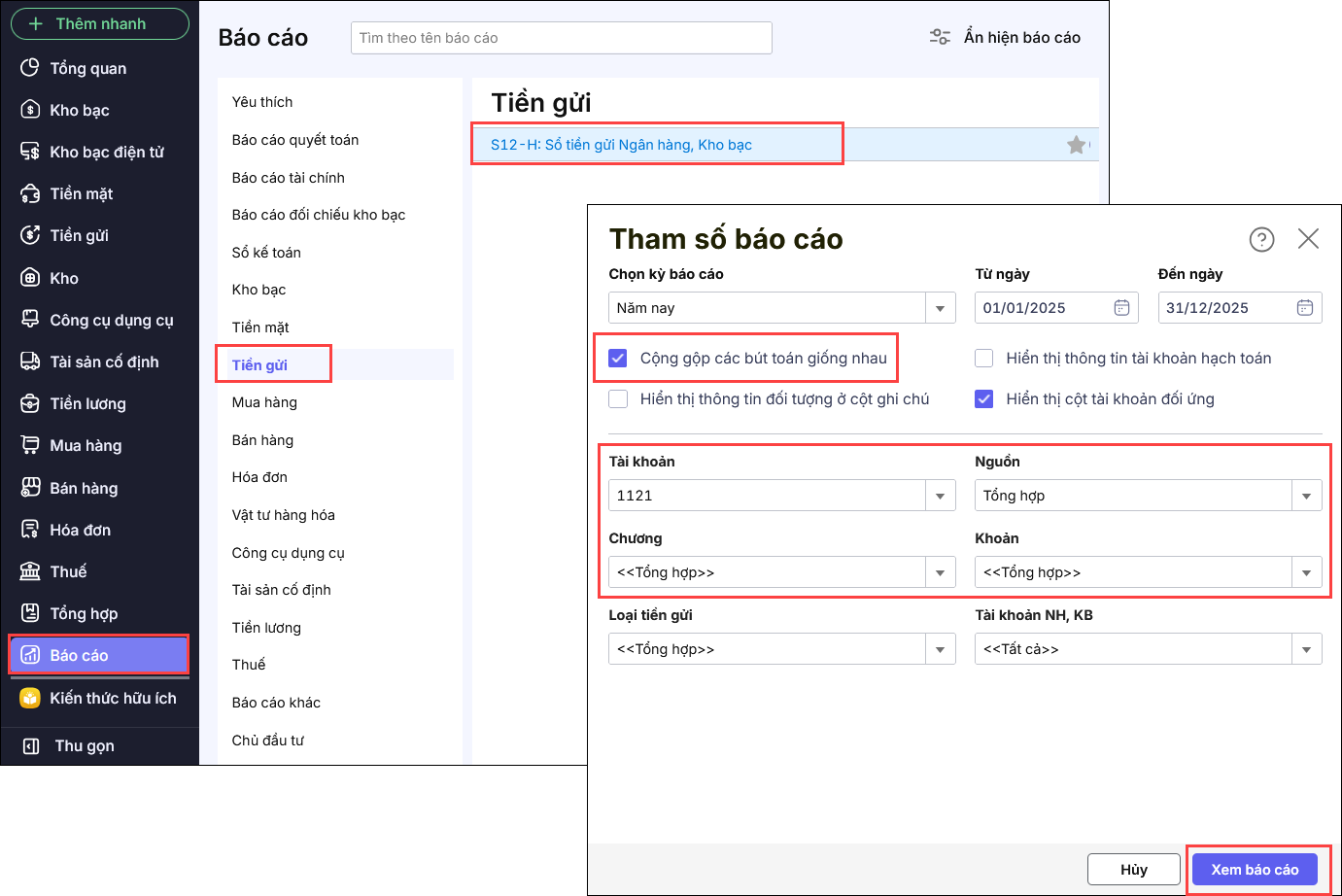 Bạn thực hiện in sổ tiền gửi ngân hàng, kho bạc để đối chiếu với số liệu phát sinh thực tế tại đơn vị.