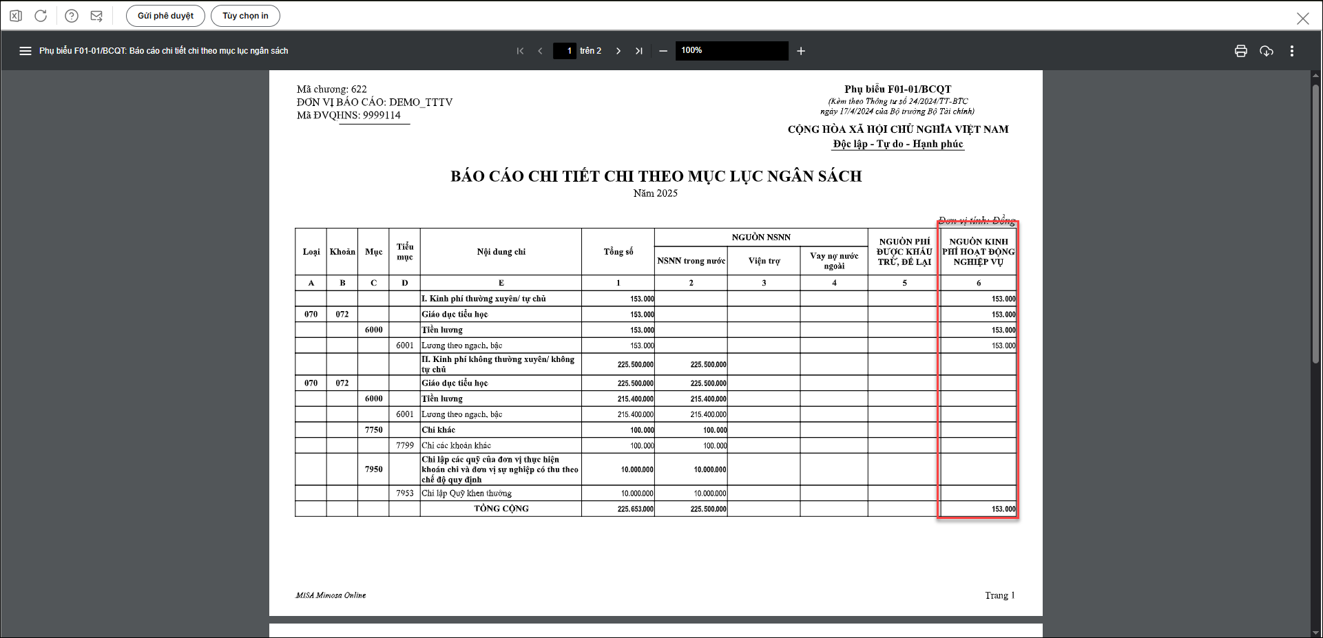 Biểu hiện: Khi in Phụ biểu F01-01/BCQT: Báo cáo chi tiết chi theo mục lục ngân sách, số liệu cột 6 – Nguồn kinh phí hoạt động nghiệp vụ lên sai số liệu