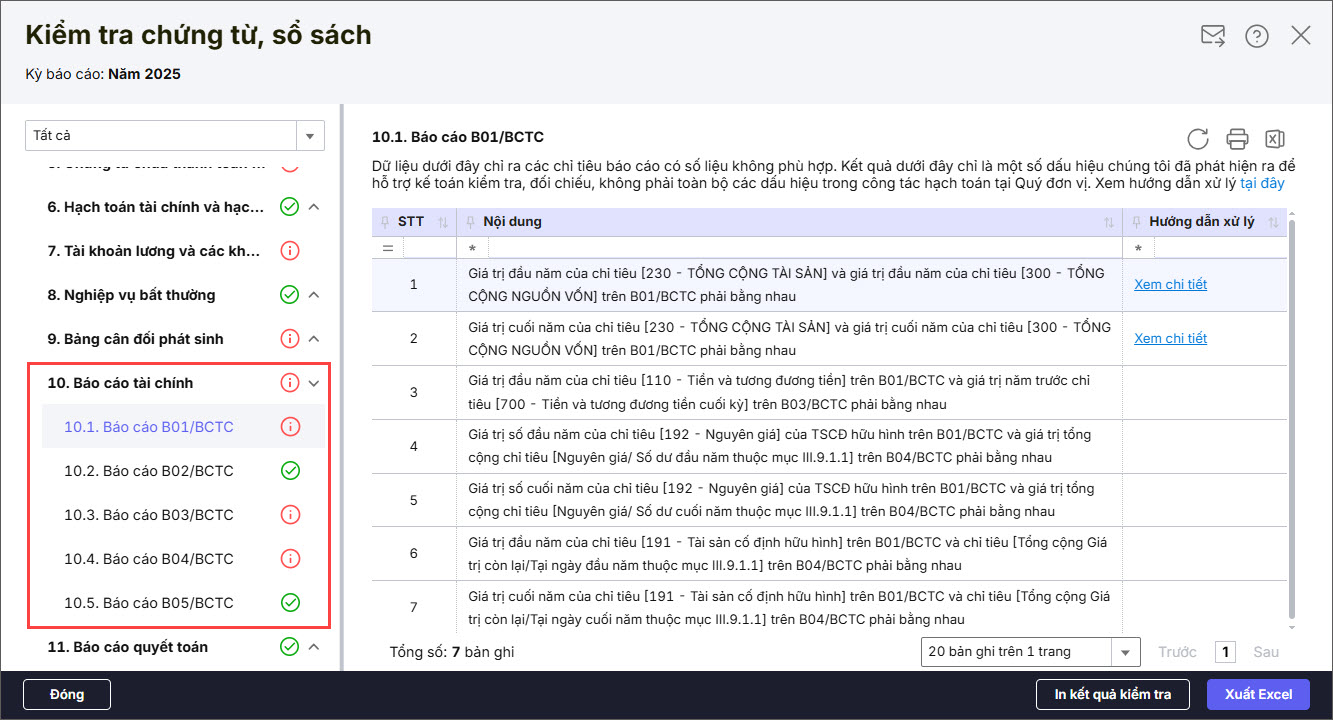 10. Kiểm tra báo cáo tài chính Hướng dẫn kế toán kiểm tra, phát hiện các chỉ tiêu báo cáo có số liệu không phù hợp. Bước 1: Vào mục Hướng dẫn quyết toán trên phần mềm. Chi tiết tại đây Bước 2: Xem hướng dẫn cách khắc phục tại đây Lượt xem: 341 Cập nhật 07/01/2026 Bài viết này hữu ích chứ? Có Không Bài viết liên quan Biểu số 4: Quyết toán thu – chi ngân sách nhà nước (Thông tư 90/2018/TT-BTC) 4.2.8. Kiểm tra các kỳ tính hao mòn TSCĐ sai nguyên tắc 4.2.6. Kiểm tra các kỳ trích khấu hao TSCĐ sai nguyên tắc Làm thế nào để phần mềm hiển thị cột Nguồn năm trước trên các màn hình nhập liệu? 8.1. Các bút toán hạch toán tài khoản Giao tự chủ Không giao tự chủ Đầu tư XDCB nhưng chọn nguồn có tính chất khác Giao tự chủ Không giao tự chủ Đầu tư XDCB 11. Kiểm tra báo cáo quyết toán Giải đáp miễn phí qua facebookNếu bạn vẫn còn thắc mắc hãy đăng câu hỏi vào cộng đồng MISA qua facebook để được giải đáp miễn phí và nhanh chóngĐĂNG BÀI NGAY