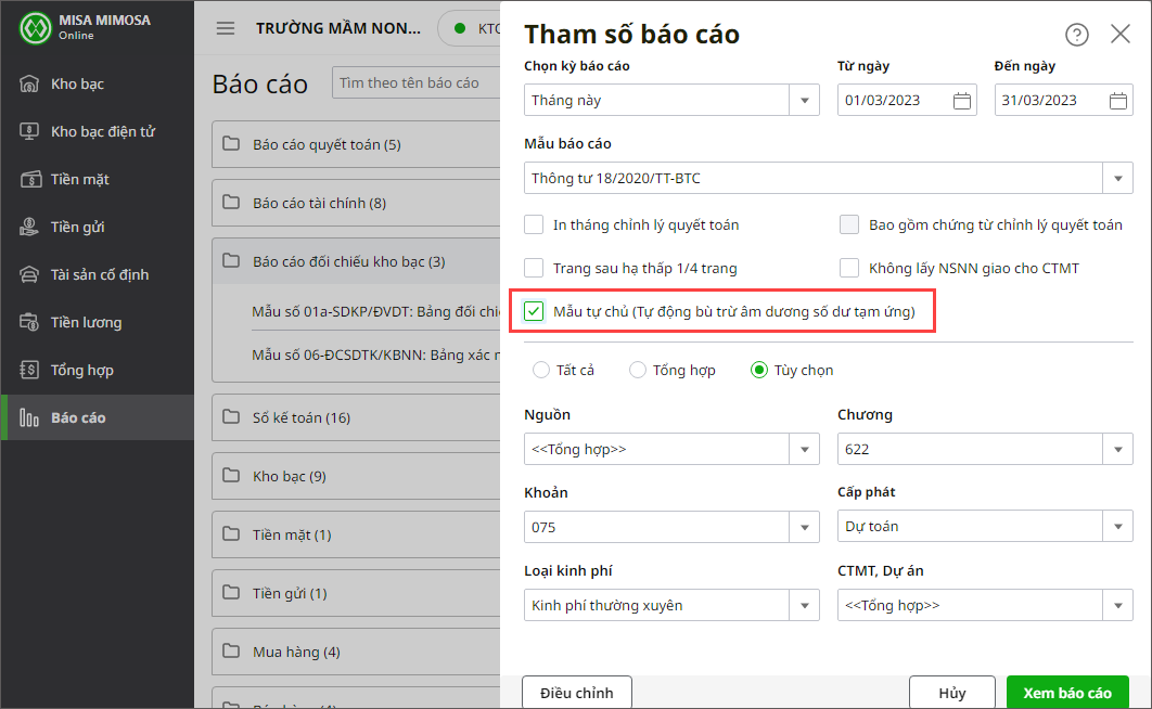 - Tích chọn vào ô Mẫu tự chủ. Nhấn Xem báo cáo.