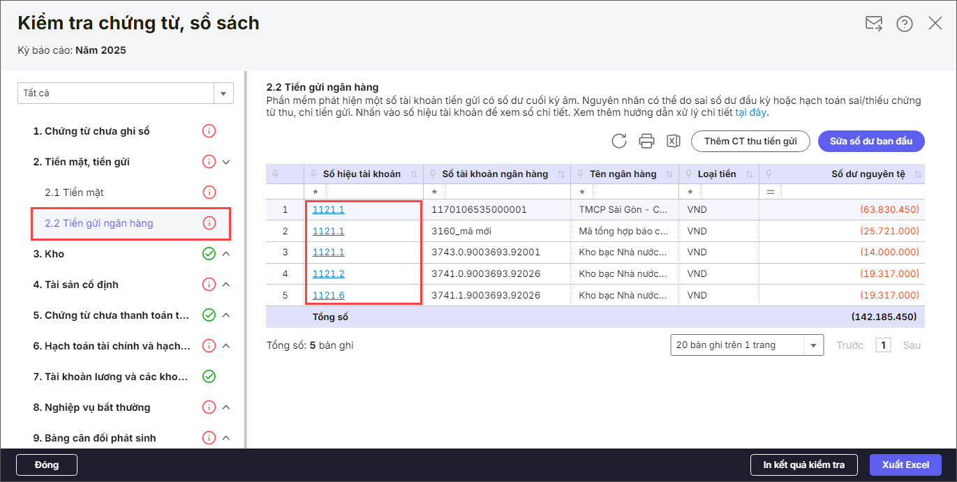 Trường hợp số dư cuối kỳ trên Sổ tiền gửi Ngân hàng, Kho bạc bị âm, chương trình sẽ hiển thị báo cáo chi tiết thể hiện thông tin: Tài khoản hạch toán, Tài khoản ngân hàng, Loại tiền và Số tiền bị âm vào cuối kỳ.