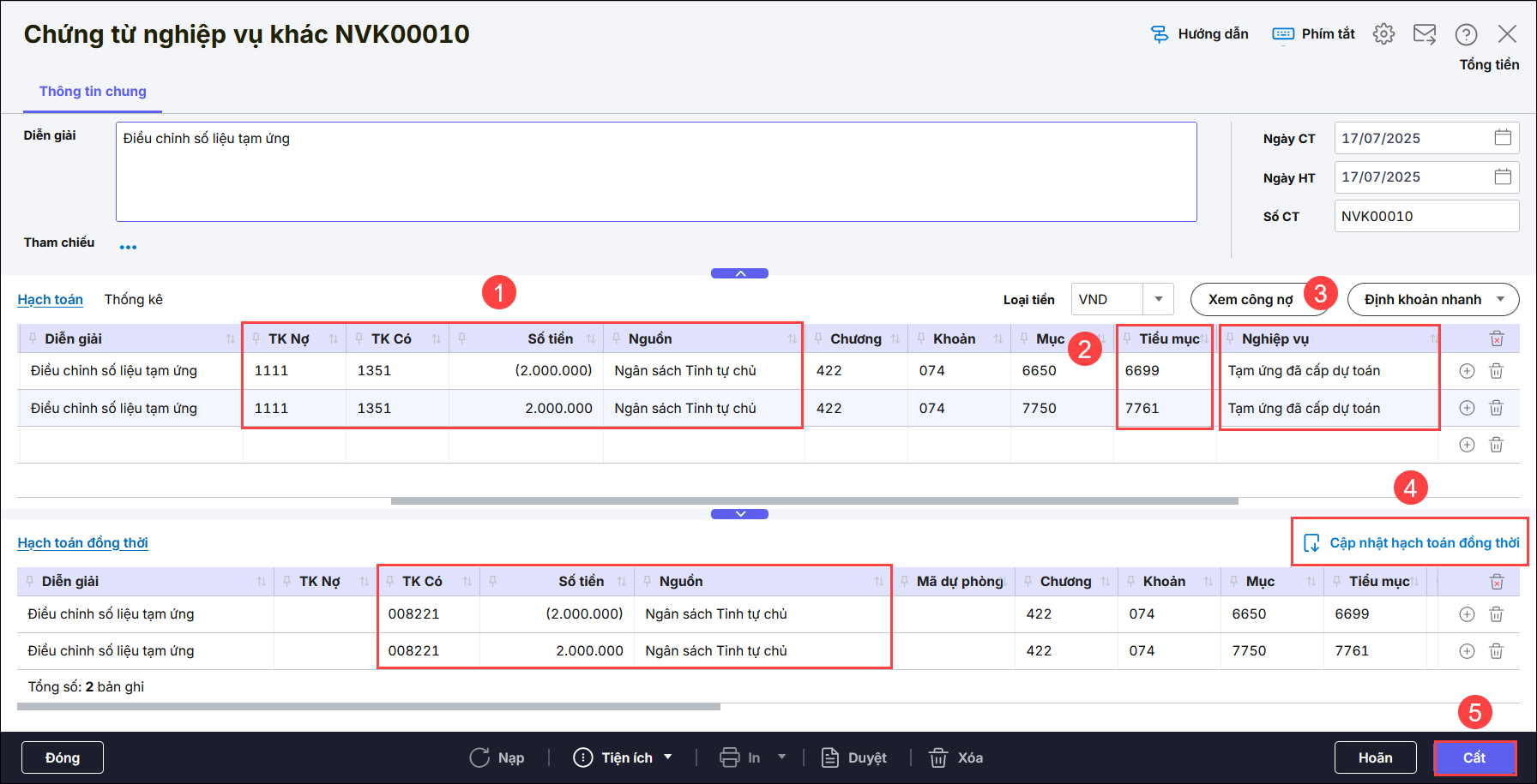• Nợ TK 1111/Có TK 1351: Số tiền dương 2.000.000, Tiểu mục 7761, nghiệp vụ chọn Tạm ứng đã cấp dự toán