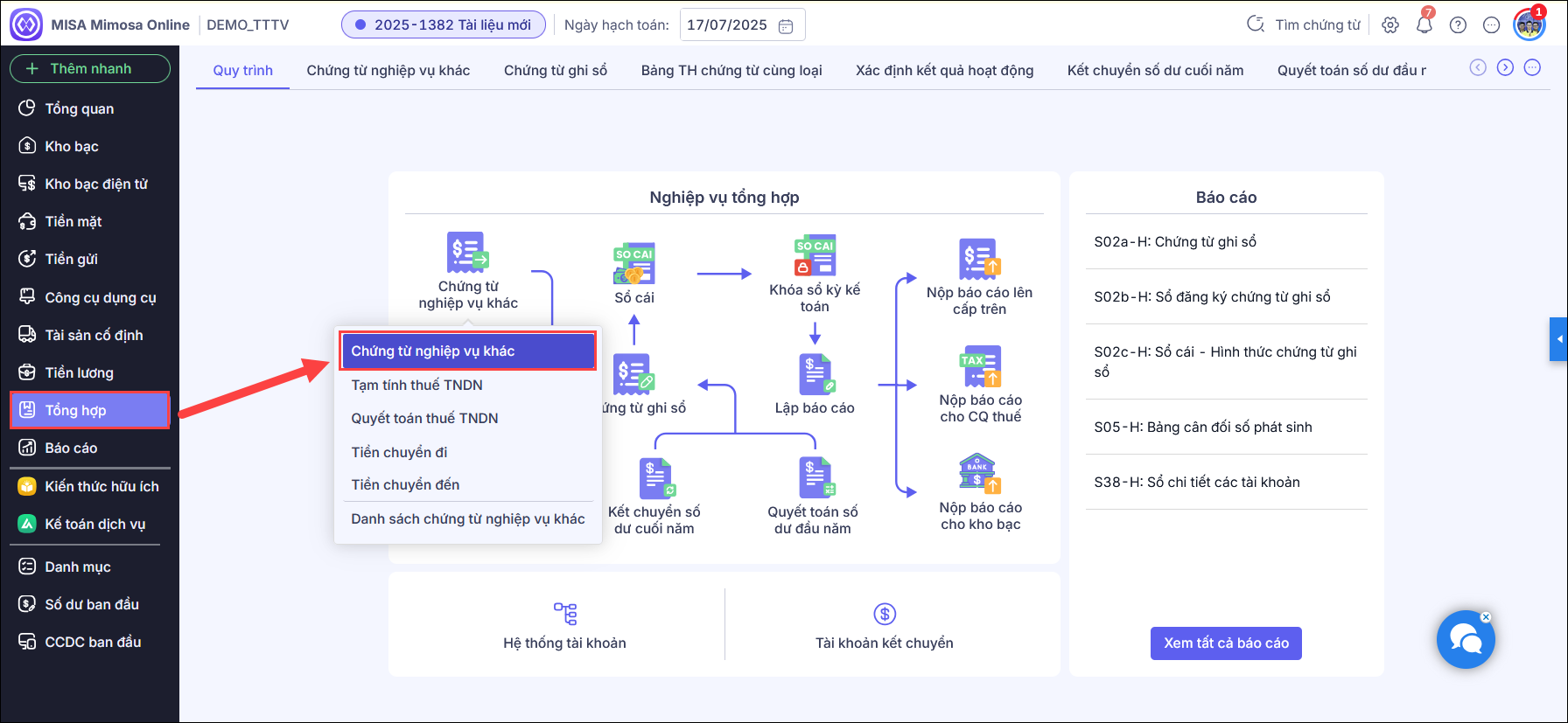 1. Vào phân hệ Tổng hợp\Chứng từ nghiệp vụ khác.