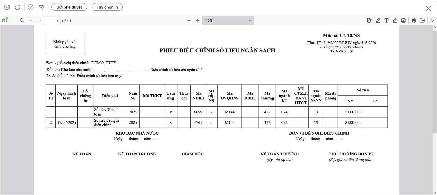 • Trên giao diện, In/chọn mẫu Phiếu điều chỉnh số liệu ngân sách (C2-10/NS) để làm thủ tục với Kho bạc.