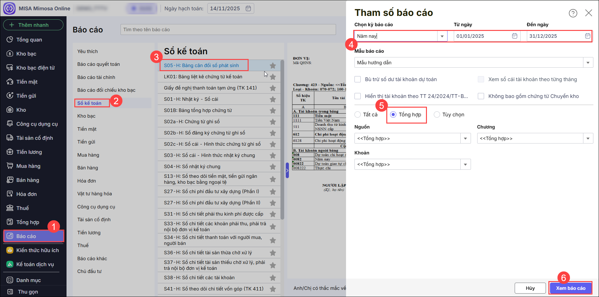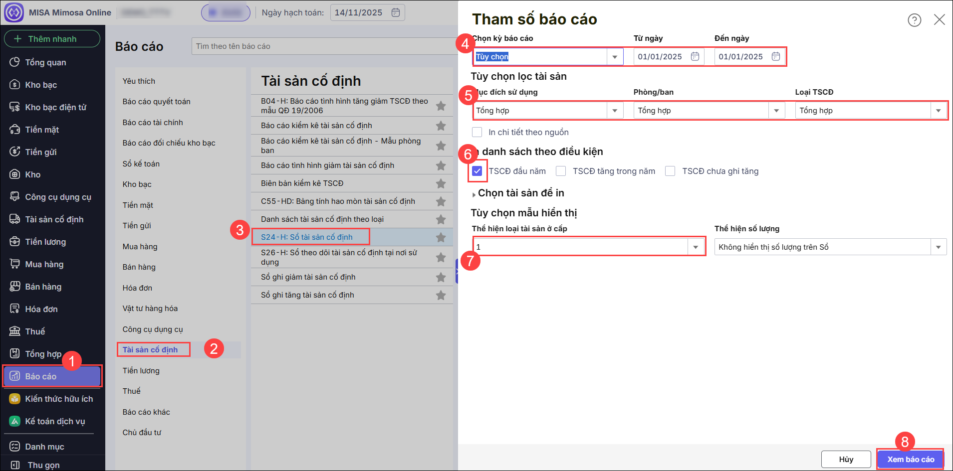4. Làm thế nào để đối chiếu số dư TK 211, 214 trên Bảng cân đối số phát sinh với Sổ TSCĐ ( Theo dõi trên MISA Mimosa Online)