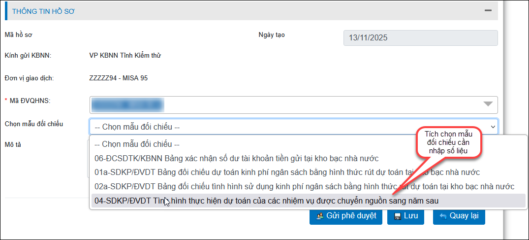 Tại mục Chọn mẫu đối chiếu, tích chọn mẫu đối chiếu 04 – SDKP/ĐVDT: Tình hình thực hiện dự toán của các nhiệm vụ được chuyển nguồn sang năm sau