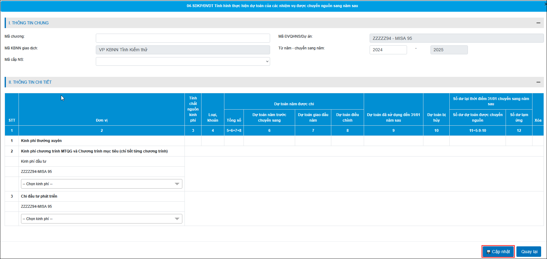 Bài viết hướng dẫn anh/chị lập Tình hình thực hiện dự toán của các nhiệm vụ được chuyển nguồn sang năm sau tại KBNN (mẫu số 04) trực tiếp trên DVC (Kho bạc nhà nước)
