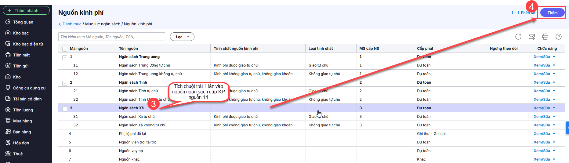 Bước 2: Căn cứ vào Nguồn cải cách tiền lương (14) sử dụng thuộc nguồn ngân sách Trung ương, Tỉnh, Xã ⇒ nhấn chuột vào nguồn cha tương ứng , tích Thêm. VD : Muốn thêm nguồn (14) thuộc nguồn ngân sách Xã , anh/chị tích chuột 1 lần vào nguồn ngân sách Xã sau đó nhấn Thêm