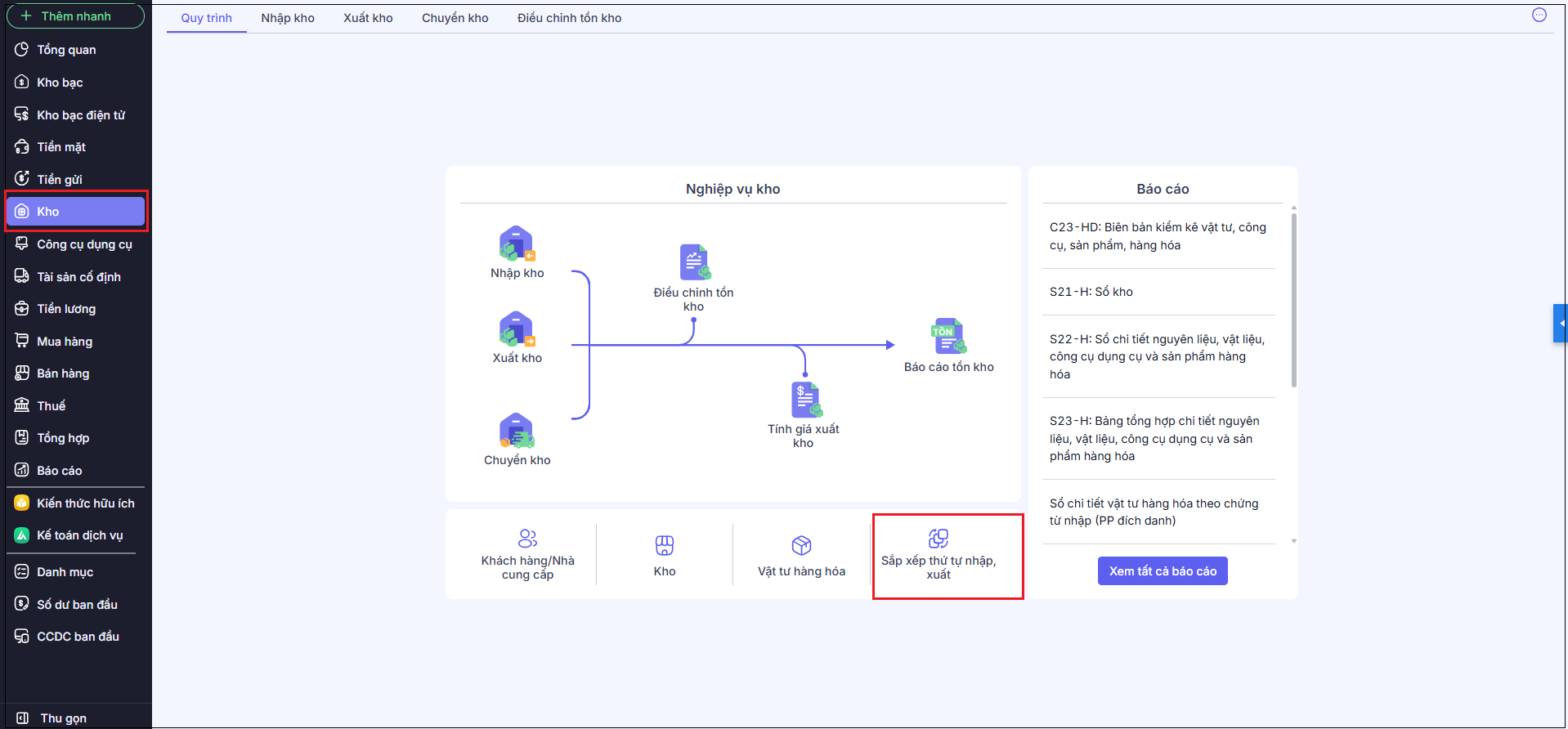 Bước 2: Vào menu Kho\Sắp xếp thứ tự nhập, xuất