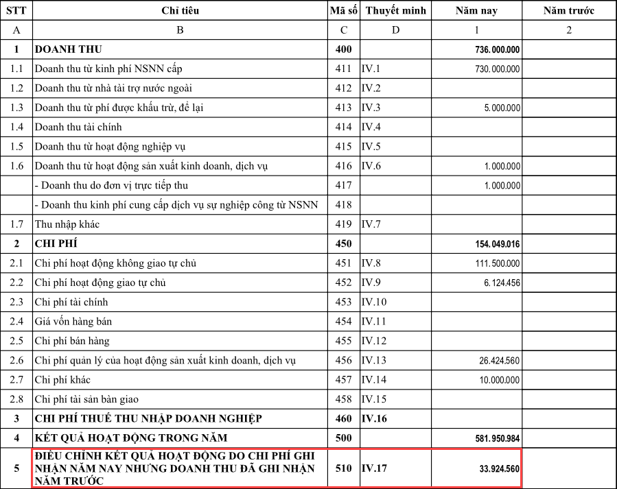 Số liệu chỉ tiêu này được tổng hợp từ những khoản chi phí phát sinh trong năm nay nhưng không có doanh thu tương ứng mà được bù đắp bằng các nguồn lực đơn vị đã tích lũy từ doanh thu những năm trước như: