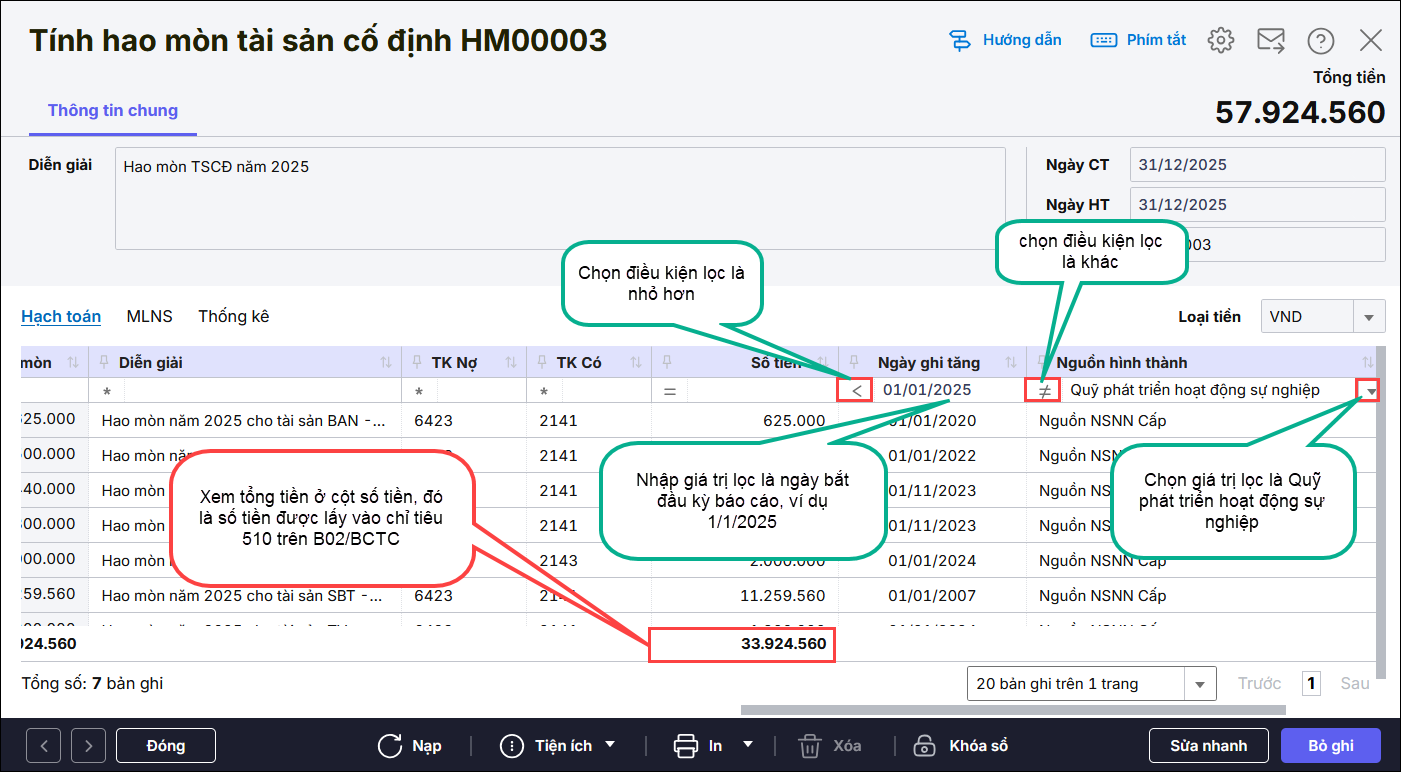 - Tại cột ngày ghi tăng, lọc ngày ghi tăng nhỏ hơn ngày bắt đầu của kỳ báo cáo, lọc nguồn hình thành khác Quỹ phát triển hoạt động sự nghiệp. Ví dụ xem báo cáo năm 2025 thì lọc ngày ghi tăng nhỏ hơn 1/1/2025