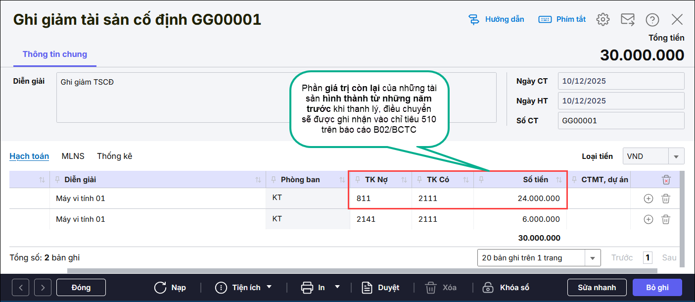 Nếu đơn vị theo dõi tài sản trên MISA Mimosa hoặc MISA QLTS và có ghi giảm (thanh lý, nhượng bán, điều chuyển), anh/chị kiểm tra như sau: