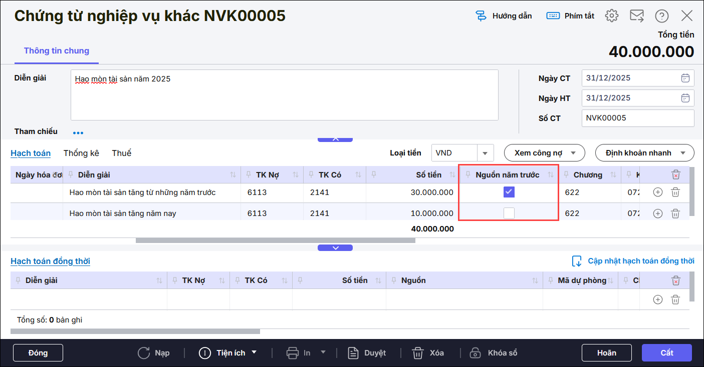 Một dòng hạch toán giá trị hao mòn, khấu hao của tài sản ghi tăng từ các năm trước → dòng này cần tích chọn “Nguồn năm trước”.