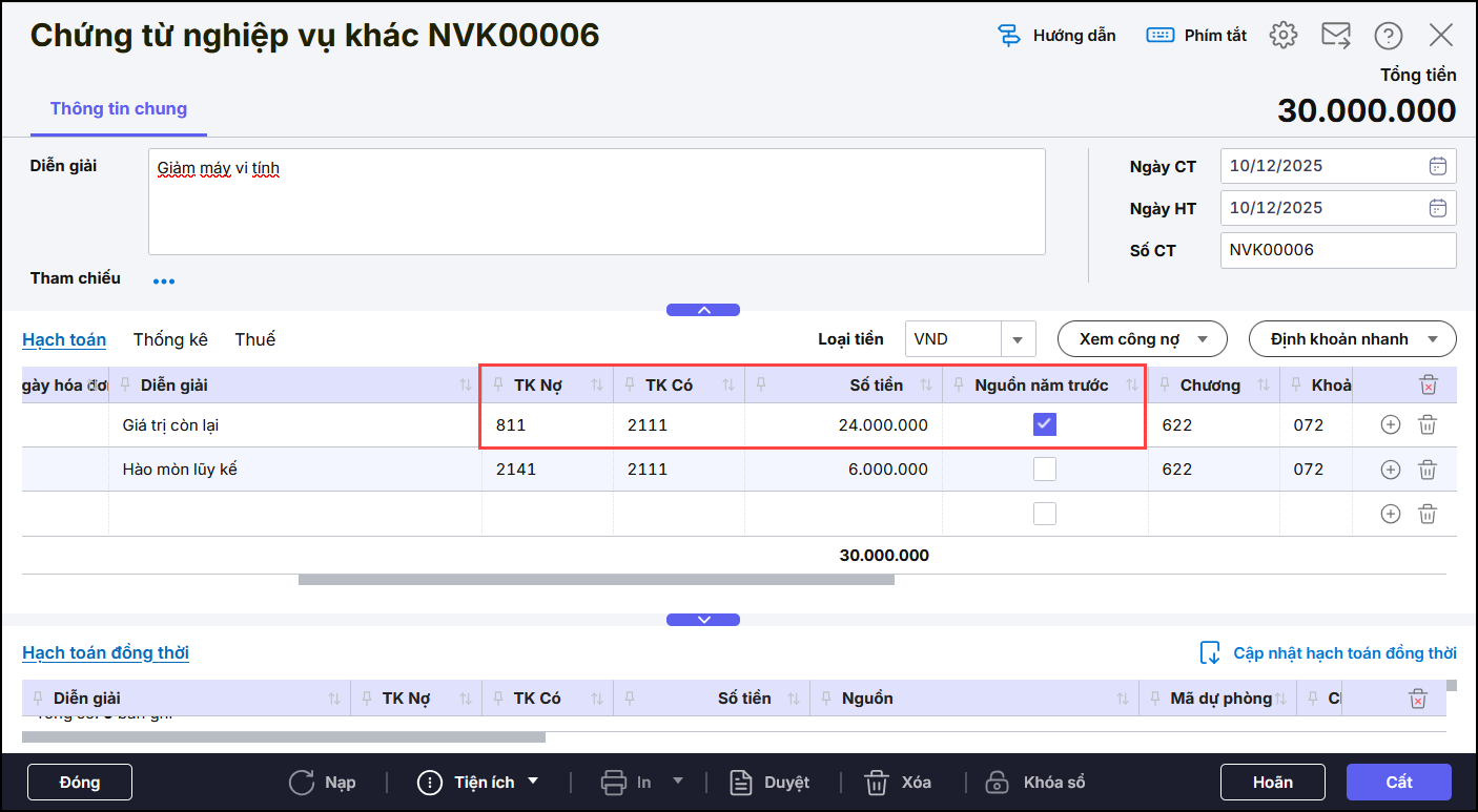 Nếu đơn vị không theo dõi tài sản trên MISA, khi hạch toán giảm tài sản ở Tổng hợp\Chứng từ nghiệp vụ khác: