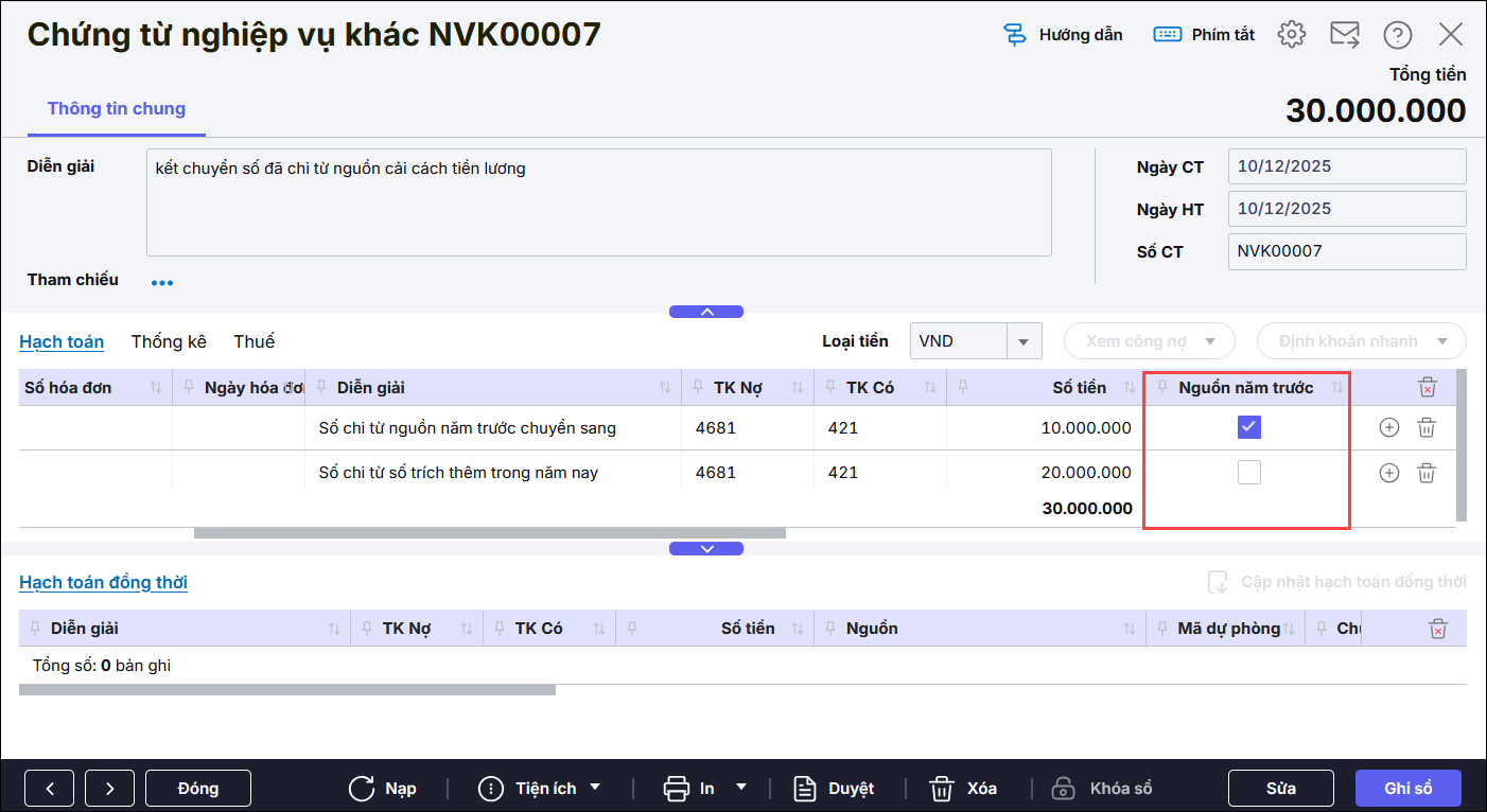 Ví dụ: Cuối năm đơn vị kết chuyển số đã chi từ nguồn cải cách tiền lương (Nợ 468/Có 421).