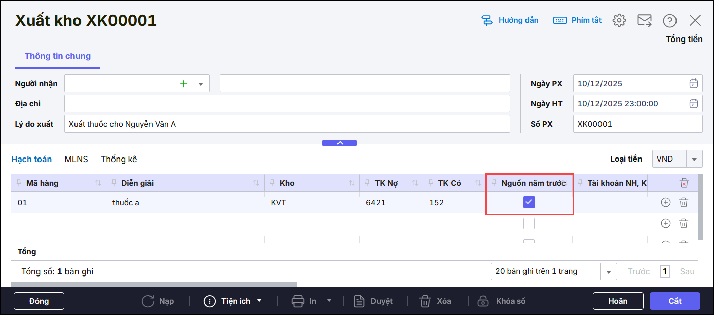 Để lấy đúng chi phí này lên chỉ tiêu 510 trên báo cáo B02/BCTC khi đơn vị có phát sinh xuất kho vậy tư hàng hóa ra để sử dụng cho vào chi phí của đơn vị (hạch toán Nợ các TK 611, 612, 641,642, 811/Có các TK 152, 153, 155,156), anh/chị cần xác định khi xuất kho phần nào xuất từ số tồn nhập từ năm trước thì sẽ tích chọn “Nguồn năm trước”.