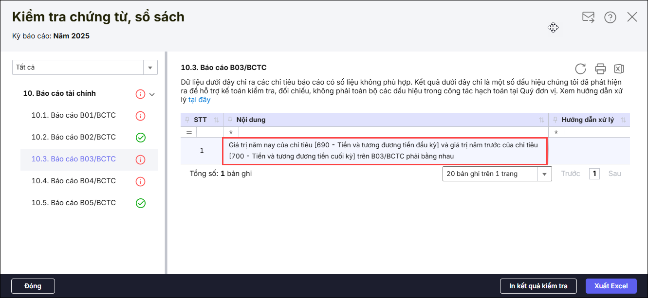 Lưu ý: Trường hợp kiểm tra báo cáo tài chính báo lỗi “Giá trị đầu năm của chỉ tiêu [110 – Tiền và tương đương tiền] trên B01/BCTC và giá trị năm trước của chỉ tiêu [700 – Tiền và tương đương tiền cuối kỳ] trên B03/BCTC phải bằng nhau” cũng thực hiện tương tự theo hướng dẫn này.