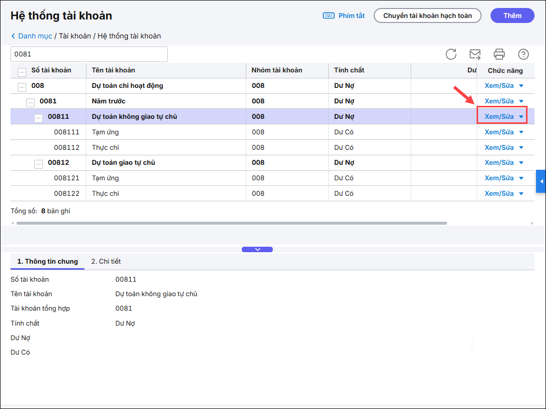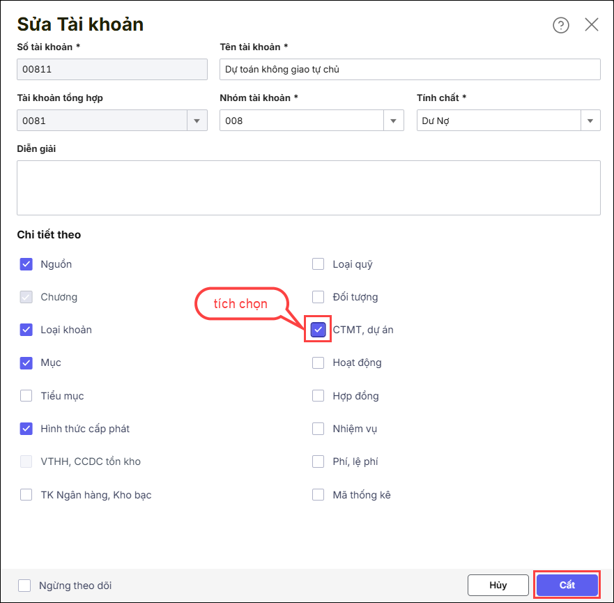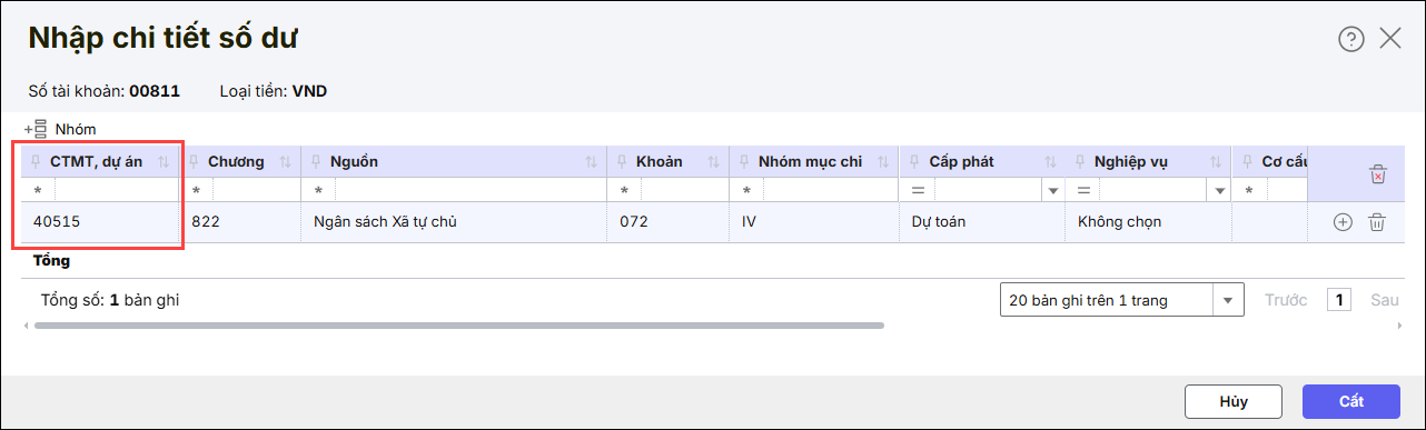 - Lọc/Tìm tài khoản cần nhập số dư theo CTMT, Dự án. Ví dụ TK 00811