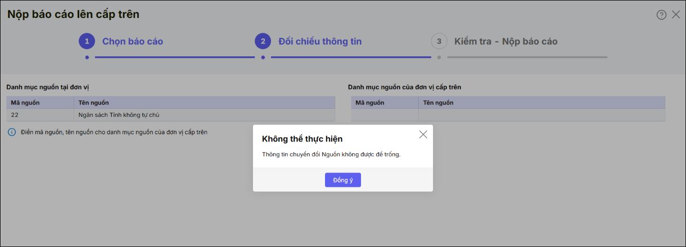 Bài viết này hướng dẫn anh/chị cách xử lý trong trường hợp nộp báo cáo cho cấp trên qua Lekima ở bước đối chiếu thông tin nhấn tiếp tục thì báo Không thể thực hiện thông tin chuyển đổi nguồn không được để trống.