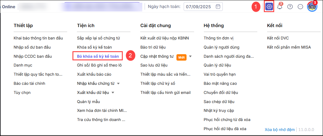 Bước 1: Vào Bánh răng ⚙ (góc phải phía trên)Tiện ích\ Bỏ khóa sổ kỳ kế toán