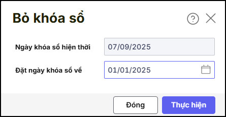 Bước 2: Đặt ngày khóa sổ kỳ kế toán về ngày đầu kỳ kế toán hoặc trước ngày chứng từ cần sửa rồi Nhấn Thực hiện