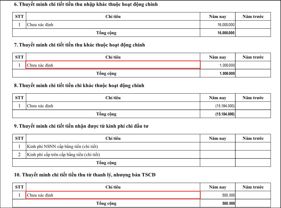 Bài viết này giúp anh/chị giải đáp được thắc mắc vì sao khi xem báo cáo B04/BCTC thấy có chỉ tiêu hiện “Chưa xác định”, ví dụ mục IV.7 Thuyết minh chi tiết thu nhập khác, V.7 Thuyết minh chi tiết tiền thu nhập khác thuộc hoạt động chính, V.10 Thuyết minh chi tiết tiền thu từ thanh lý, nhượng bán TSCĐ….  và cách để sửa lại để báo cáo tường minh, rõ ràng hơn.