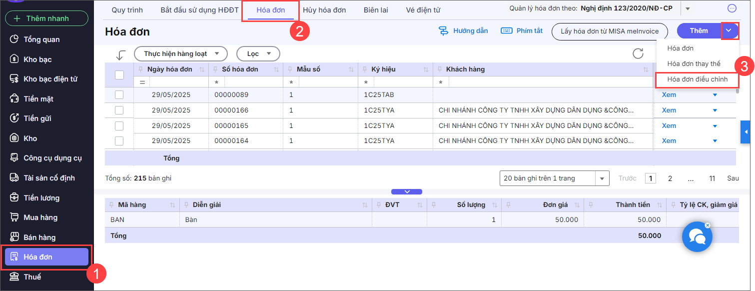 Bước 2. Chọn hóa đơn được điều chỉnh