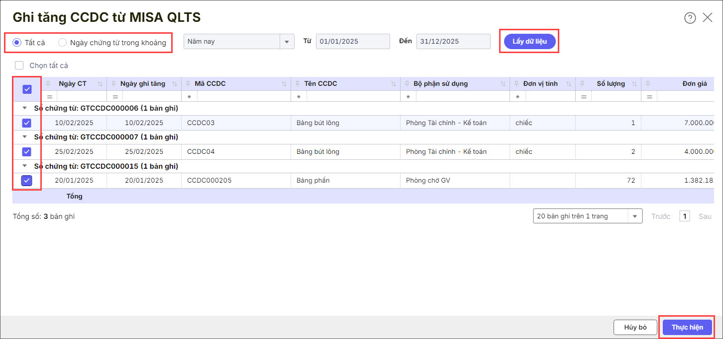 Lấy chứng từ ghi tăng CCDC từ MISA QLTS về Mimosa Online