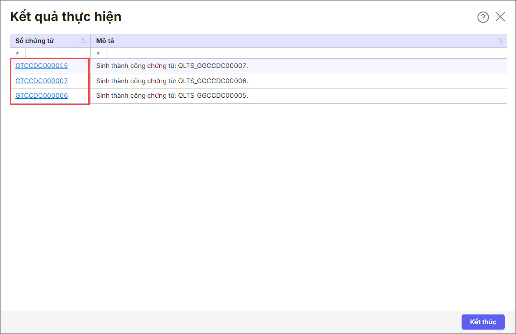 • Nhấn vào Số chứng từ tại Kết quả thực hiện để xem chi tiết.