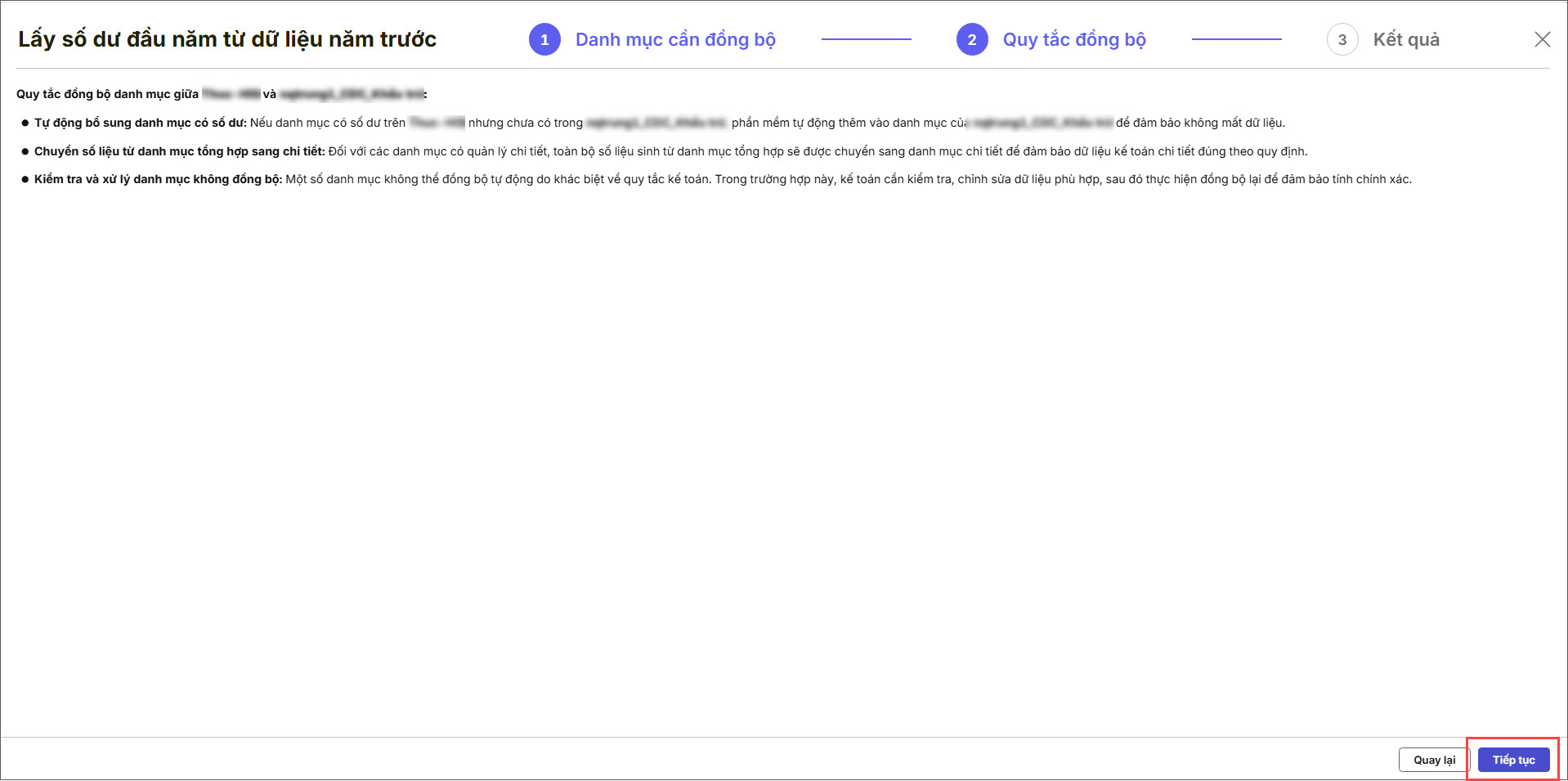 - Kiểm tra các danh mục cần đồng bộ hệ thống đã lấy lên. Nhấn Tiếp tục.