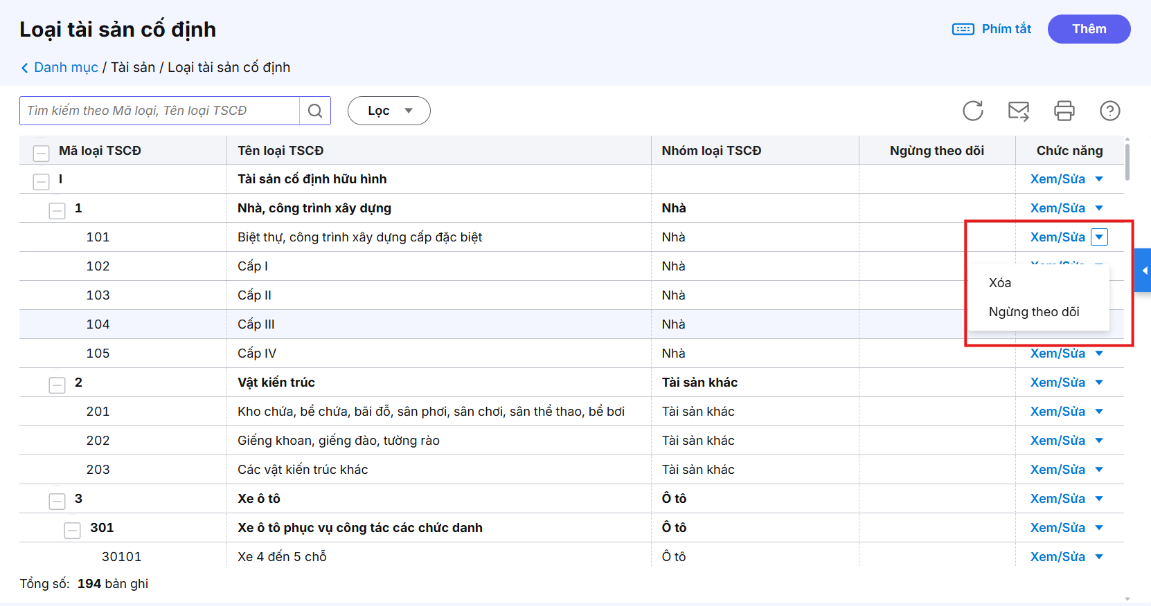 Bước 2: Để thêm mới loại tài sản cố định, nhấn Thêm ở góc phải màn hình.