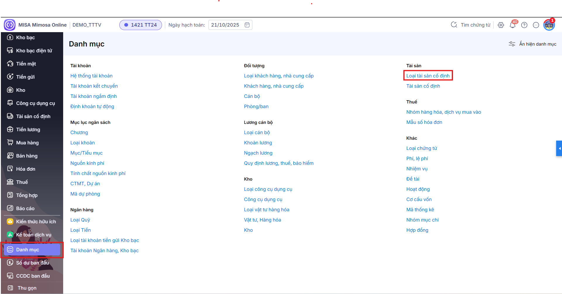 Bước 1: Chọn menu Danh mục\Loại tài sản cố định.