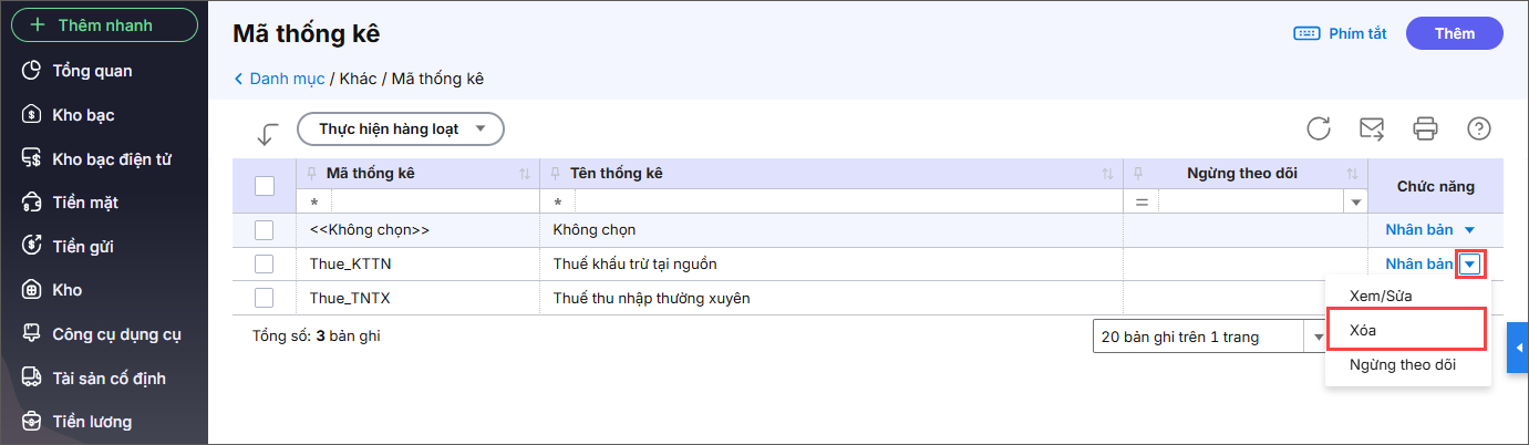 Bước 3: Tại Mã thống kê cần xóa, nhấn vào biểu tượng ⏷ ở cột Chức năng rồi nhấn Xóa.