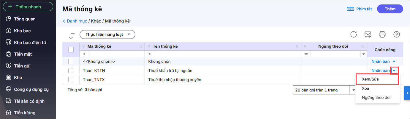 Bước 3: Tại Mã thống kê cần sửa, nhấn vào biểu tượng ⏷ ở cột Chức năng rồi nhấn Xem/Sửa.