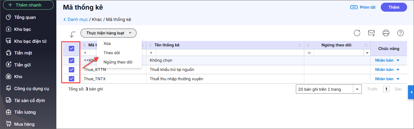 Trường hợp cần xóa/theo dõi/ngừng theo dõi hàng loạt danh mục cùng lúc, bạn làm như sau: