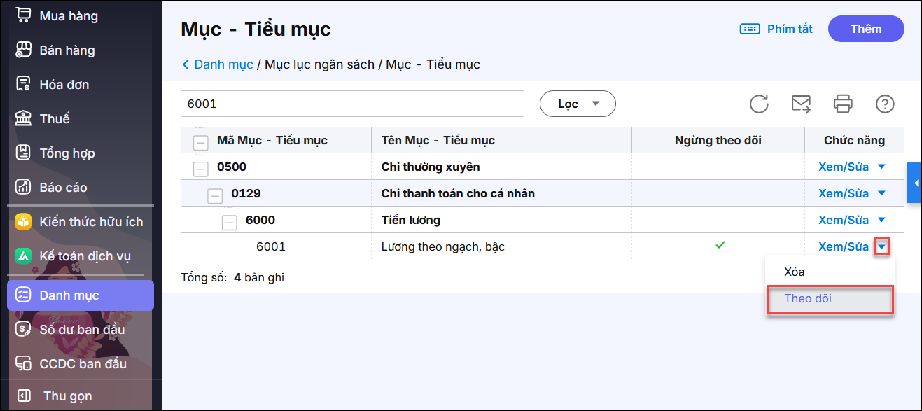 • Nếu Mục/Tiểu mục đã có, trên chứng từ không muốn hiện ra để tránh chọn nhầm thì chọn Ngừng theo dõi.