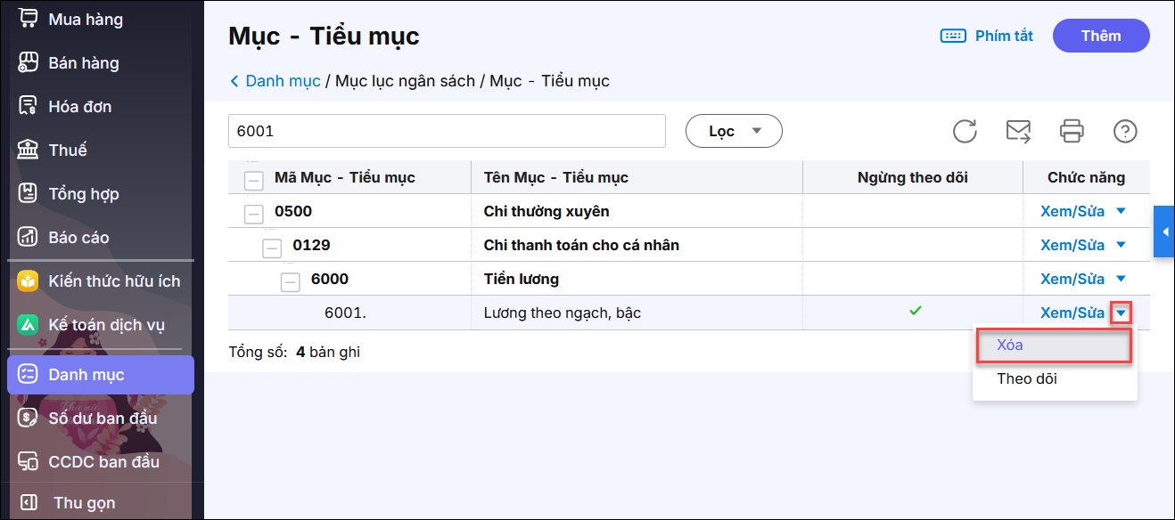 Lưu ý: Nếu Mục/Tiểu mục đã có phát sinh bạn cần sửa các phát sinh về tiểu mục đúng trước rồi mới thực hiện xóa.