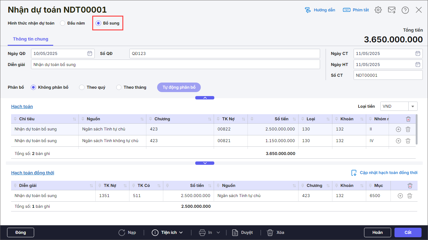 – Tích chọn Hình thức nhận dự toán là Bổ sung.