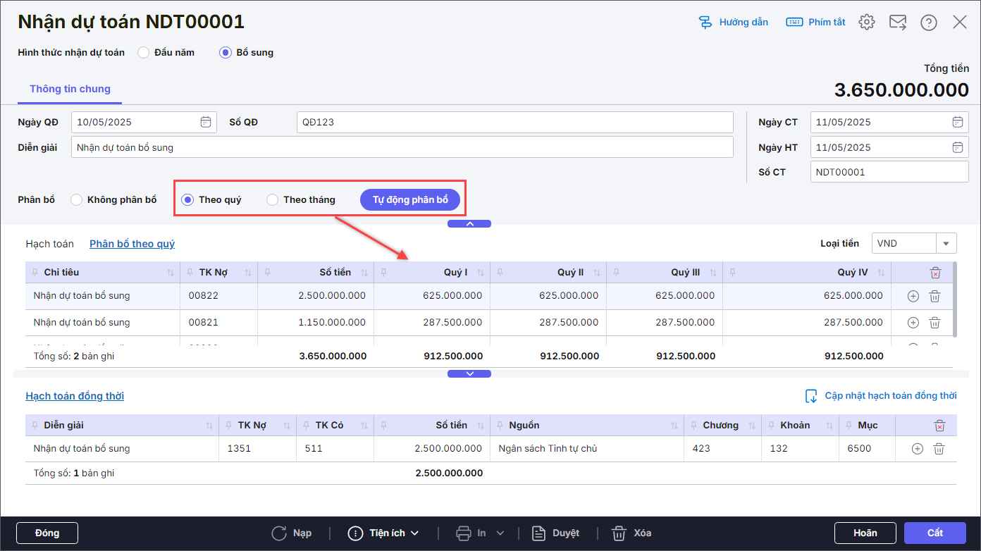 3. Nếu phân bổ dự toán theo Quý hoặc Tháng thì thực hiện như sau: