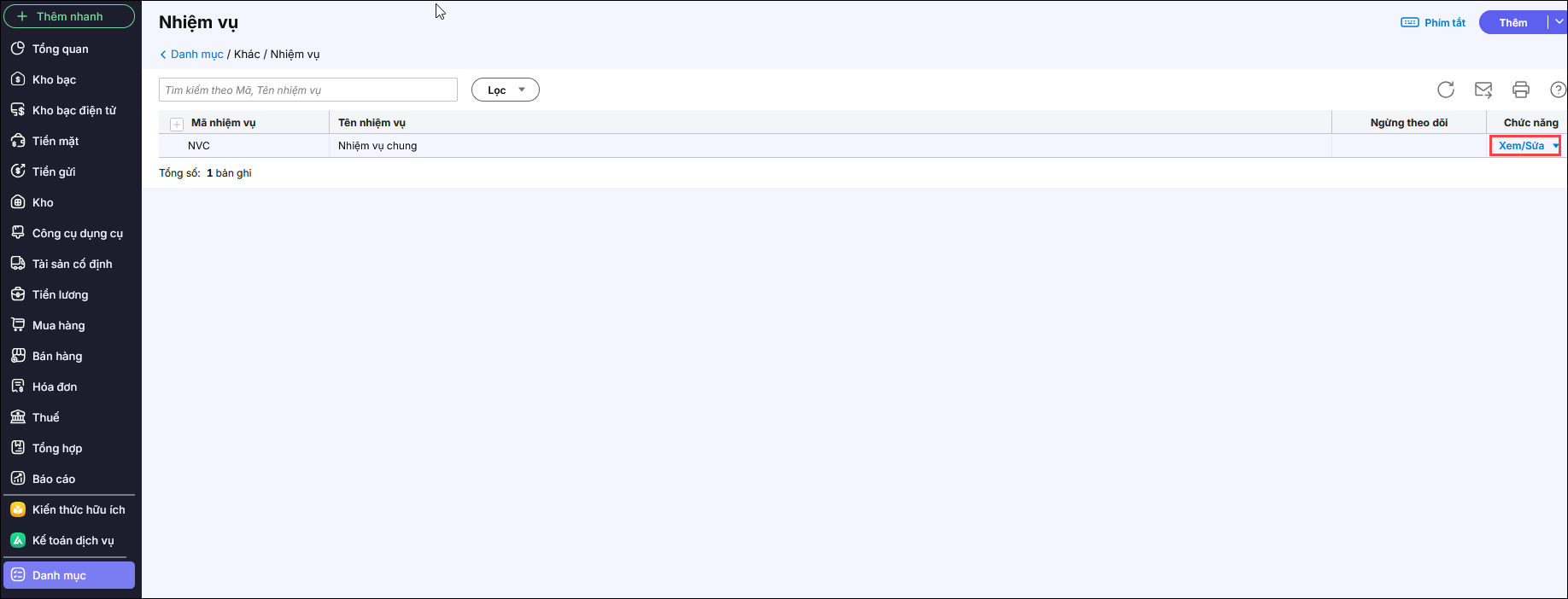 Bước 5: Nhấn Cất. 2.3. Sửa nhiệm vụBước 1: Chọn menu Danh mục\Nhiệm vụ Bước 2: Nhấn Xem/Sửa