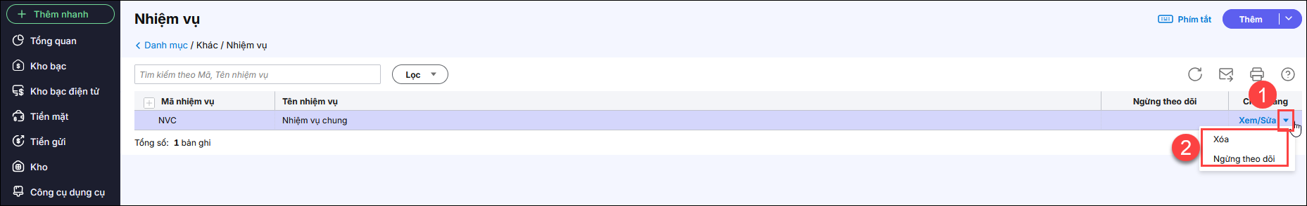 Bài viết giúp anh/chị theo dõi , thêm , sửa , xóa , ngừng theo dõi danh mục Nhiệm vụ nhằm theo dõi được các nhiệm vụ thực tế tại đơn vị.